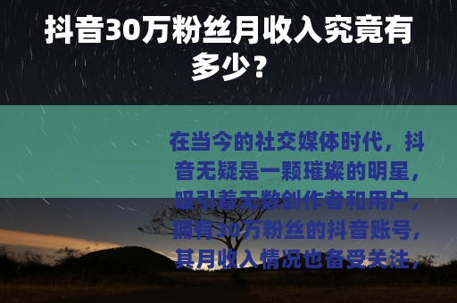 在当今的社交媒体时代,抖音无疑是一颗璀璨的明星,吸引着无数创作者和用户,拥有30万粉丝的抖音账号,其月收入情况也备受关注。
