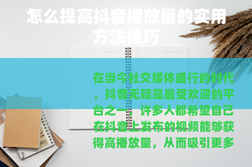 在当今社交媒体盛行的时代,抖音无疑是最受欢迎的平台之一,许多人都希望自己在抖音上发布的视频能够获得高播放量,从而吸引更多的关注和粉丝,怎么提高抖音播放量呢?以下是一些实用的方法技巧。 是关键,要确保你的视频内容具有吸引力和独特性,可以从热门话题入手,结合自己的风格和特长,制作出有趣、有用或有情感共鸣的视频,如果你擅长烹饪,那么可以制作各种美味菜肴的烹饪教程;如果你是个旅行爱好者,就分享你的旅行经历和见闻,这样的内容能够吸引到特定的受众群体,增加视频的播放量。