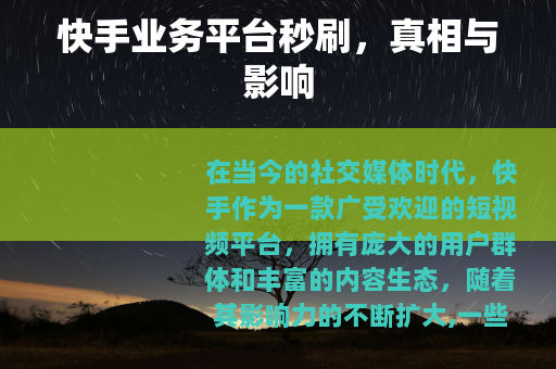 在当今的社交媒体时代,快手作为一款广受欢迎的短视频平台,拥有庞大的用户群体和丰富的内容生态,随着其影响力的不断扩大,一些所谓的快手业务平台秒刷服务也悄然出现。