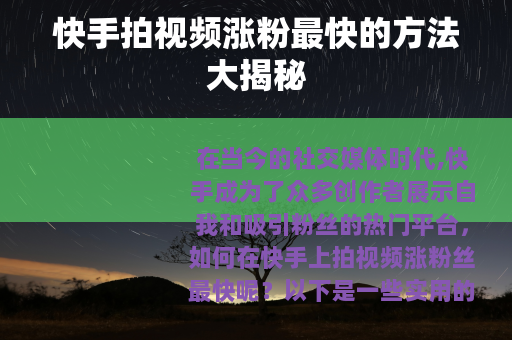 在当今的社交媒体时代,快手成为了众多创作者展示自我和吸引粉丝的热门平台,如何在快手上拍视频涨粉丝最快呢?以下是一些实用的方法。 是关键,要确保你的视频内容具有独特性和吸引力,可以从自身的兴趣爱好、特长技能出发,比如你擅长烹饪,那就可以制作一系列精美的美食制作视频,详细展示每一道菜肴的制作过程,从食材准备到烹饪技巧,再到最后的成品展示,让观众在观看过程中不仅能学到知识,还能感受到美食的魅力,如果你热爱旅行,那就记录下旅途中的美景、有趣的人和事,通过你的镜头带领观众领略不同地方的风土人情,这样的内容很容易引起观众的共鸣,从而吸引他们关注你的账号。