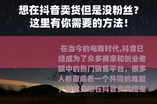 在当今的电商时代,抖音已经成为了众多商家和创业者眼中的热门销售平台,很多人都面临着一个共同的难题,那就是想在抖音卖货但是没粉丝,这确实是一个令人头疼的问题,但不要担心,只要掌握了正确的方法,你依然可以在抖音上实现自己的卖货梦想。