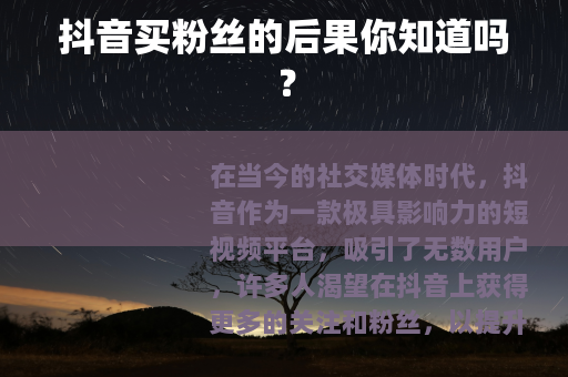 在当今的社交媒体时代,抖音作为一款极具影响力的短视频平台,吸引了无数用户,许多人渴望在抖音上获得更多的关注和粉丝,以提升自己的影响力和知名度,一些人可能会动起歪脑筋,想到通过购买粉丝来快速增加自己的粉丝数量,但这种看似捷径的做法,其实隐藏着诸多严重的后果。