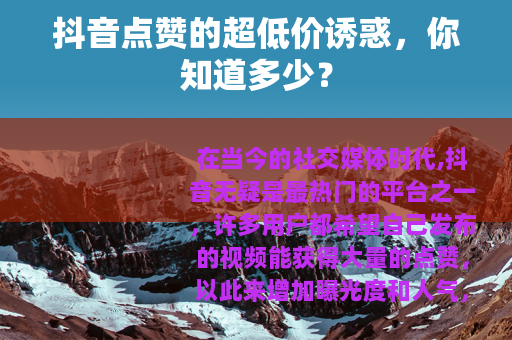 在当今的社交媒体时代,抖音无疑是最热门的平台之一,许多用户都希望自己发布的视频能获得大量的点赞,以此来增加曝光度和人气,而在网络上,我们常常会看到一些声称可以提供超低价点赞服务的信息,0.1元1000赞全网最低价抖音”这样的广告。