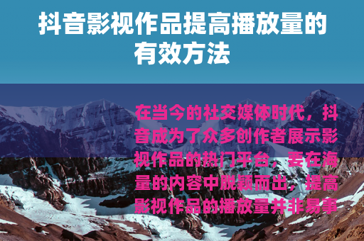 在当今的社交媒体时代,抖音成为了众多创作者展示影视作品的热门平台,要在海量的内容中脱颖而出,提高影视作品的播放量并非易事,以下是一些有助于提高抖音影视作品播放量的方法。 质量是关键,确保你的影视作品具有独特性和吸引力,能够抓住观众的眼球,一个精彩的故事、出色的表演或者令人惊叹的视觉效果都能让观众更愿意停留并观看你的作品,在创作过程中,要注重细节,精心打磨每一个镜头,从剧本构思到拍摄手法,再到后期剪辑,都要力求做到尽善尽美。