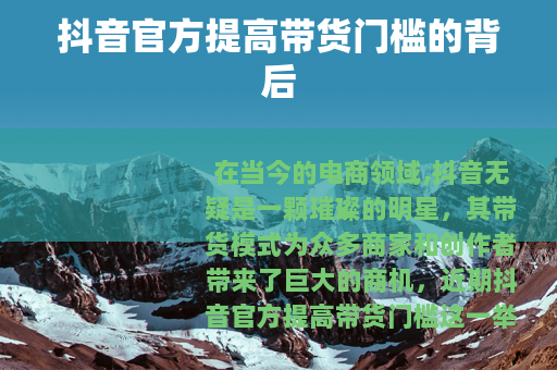 在当今的电商领域,抖音无疑是一颗璀璨的明星,其带货模式为众多商家和创作者带来了巨大的商机,近期抖音官方提高带货门槛这一举措,引起了广泛的关注和讨论。