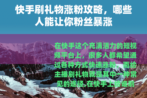 在快手上找到合适的主播刷礼物,是一种可以有效增加粉丝数量的方法,但也要注意合理安排预算,避免过度投入,通过精心选择刷礼物的对象,并结合自身账号特点,相信你在快手上的涨粉之路会更加顺利。