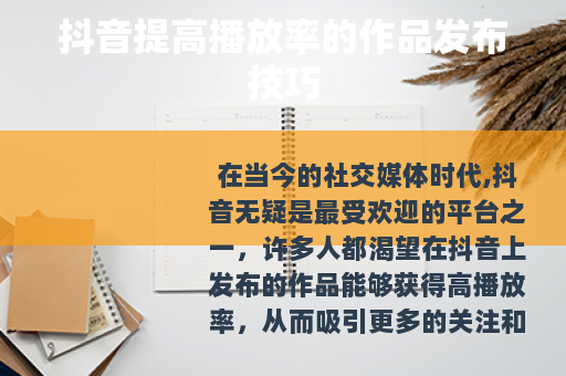 在当今的社交媒体时代,抖音无疑是最受欢迎的平台之一,许多人都渴望在抖音上发布的作品能够获得高播放率,从而吸引更多的关注和粉丝,抖音怎么发可以提高播放率的作品呢?以下是一些实用的技巧。 是关键,要确保你的作品具有独特性和吸引力,可以从自身的兴趣、特长或当下热门的话题中寻找灵感,创作出与众不同且能引发观众共鸣的内容,如果你擅长烹饪,那么可以制作一系列精美的美食制作视频,详细展示每一个步骤和独特的烹饪技巧,让观众在观看的过程中不仅能够学到知识,还能感受到美食的魅力。