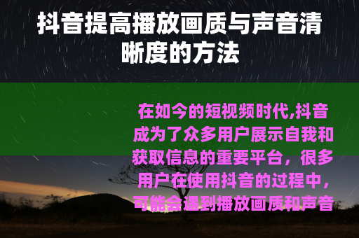 在如今的短视频时代,抖音成为了众多用户展示自我和获取信息的重要平台,很多用户在使用抖音的过程中,可能会遇到播放画质和声音清晰度不够理想的情况,该如何提高抖音的播放画质和声音清晰度呢?