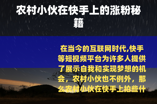 在当今的互联网时代,快手等短视频平台为许多人提供了展示自我和实现梦想的机会,农村小伙也不例外,那么农村小伙在快手上拍些什么能够快速涨粉呢?