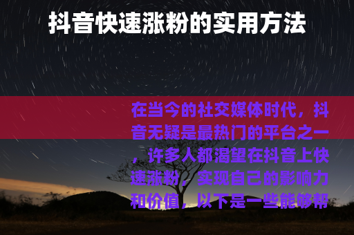 在当今的社交媒体时代,抖音无疑是最热门的平台之一,许多人都渴望在抖音上快速涨粉,实现自己的影响力和价值,以下是一些能够帮助你在抖音上快速涨粉的有效方法。 质量是关键,你需要提供有价值、有趣、独特且能引起观众共鸣的内容,无论是搞笑视频、知识分享、美食制作还是生活趣事,都要确保你的视频在众多内容中脱颖而出,深入了解你的目标受众,知道他们的兴趣和需求,从而制作出符合他们口味的视频,这样才能吸引他们的关注并促使他们成为你的粉丝。