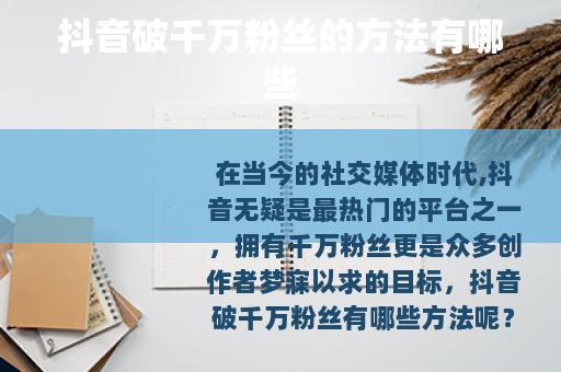 在当今的社交媒体时代,抖音无疑是最热门的平台之一,拥有千万粉丝更是众多创作者梦寐以求的目标,抖音破千万粉丝有哪些方法呢? 的独特性至关重要,要想在海量的抖音视频中脱颖而出,创作者需要提供与众不同的内容,这可以是独特的视角、新颖的创意,或者是在某个特定领域的深度挖掘,有的创作者专注于传统手工艺的展示,通过精美的制作过程和背后的文化故事吸引了大量粉丝;还有的创作者以幽默搞笑的短剧形式呈现生活中的点滴,让人忍俊不禁,从而获得了极高的关注度。