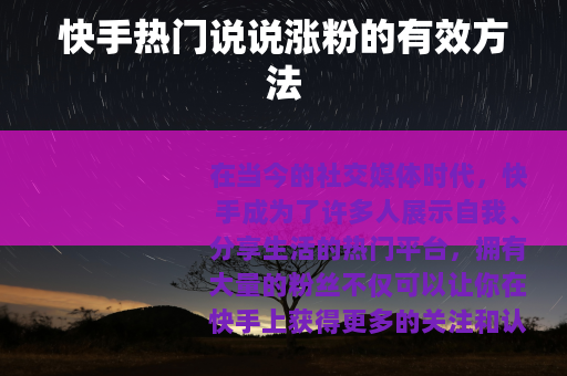 在当今的社交媒体时代,快手成为了许多人展示自我、分享生活的热门平台,拥有大量的粉丝不仅可以让你在快手上获得更多的关注和认可,还可能为你带来各种机会,如何通过热门说说来实现快手涨粉呢? 的独特性是关键,你的说说要能够展现出你的个性、风格或专业知识,如果你擅长烹饪,你可以分享一些独特的食谱或烹饪技巧,用生动有趣的语言描述制作过程,让观众在阅读你的说说时仿佛能闻到美食的香气,从而吸引他们的关注并引发共鸣。