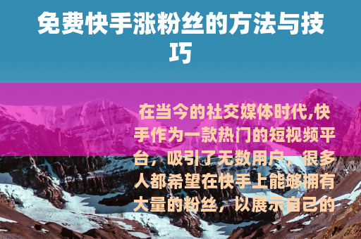在当今的社交媒体时代,快手作为一款热门的短视频平台,吸引了无数用户,很多人都希望在快手上能够拥有大量的粉丝,以展示自己的才华、分享生活点滴或推广自己的业务等,而其中,免费涨粉丝更是大家所关注的焦点。