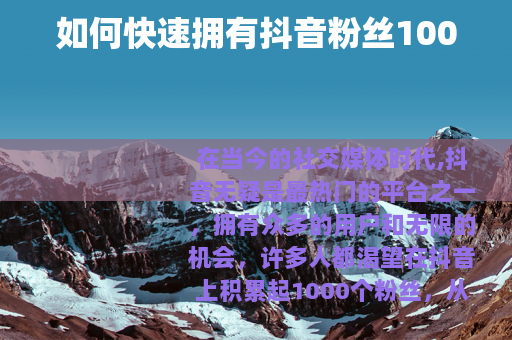 通过以上这些方法的综合运用,你就有更大的机会在抖音上快速积累起1000个粉丝,开启你的抖音之旅,在这个充满活力的平台上展现自己的风采,收获更多的关注和喜爱。