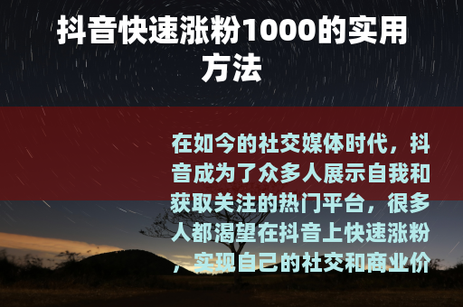在如今的社交媒体时代,抖音成为了众多人展示自我和获取关注的热门平台,很多人都渴望在抖音上快速涨粉,实现自己的社交和商业价值,抖音怎么快速涨粉1000呢?以下是一些实用的方法。