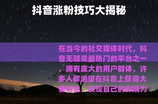 在当今的社交媒体时代,抖音无疑是最热门的平台之一,拥有庞大的用户群体,许多人都渴望在抖音上获得大量粉丝,实现自己的影响力和价值,下面就为大家分享一些实用的抖音涨粉技巧。 创作是关键,要确保你的视频内容具有独特性和吸引力,可以从自身的兴趣爱好、特长出发,挖掘一些与众不同的主题,如果你擅长烹饪,那就可以制作各种精美的美食制作视频,详细展示每一个步骤和独特的烹饪技巧,让观众在观看的过程中不仅能学到东西,还能感受到美食的魅力,要注意视频的趣味性,通过幽默的语言、有趣的情节设置等方式,让观众在轻松愉快的氛围中观看视频,从而更容易产生共鸣和关注。