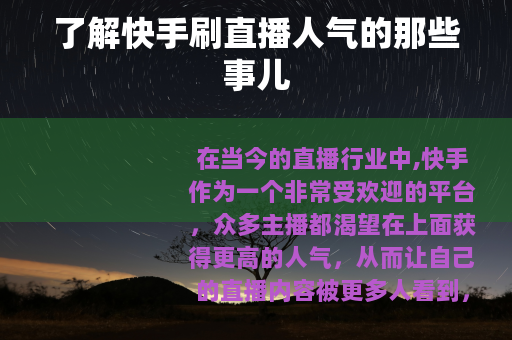 在当今的直播行业中,快手作为一个非常受欢迎的平台,众多主播都渴望在上面获得更高的人气,从而让自己的直播内容被更多人看到,这也使得一些关于快手刷直播人气的话题备受关注。