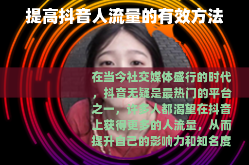 要提高抖音人流量需要从多个方面入手,不断优化自己的内容和运营策略,持续努力和创新,才能在抖音这个竞争激烈的平台上获得更多的关注和流量。