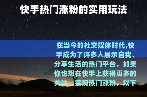 在当今的社交媒体时代,快手成为了许多人展示自我、分享生活的热门平台,如果你也想在快手上获得更多的关注,实现热门涨粉,以下是一些实用的玩法。
