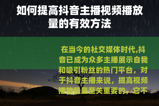 在当今的社交媒体时代,抖音已成为众多主播展示自我和吸引粉丝的热门平台,对于抖音主播来说,提高视频播放量是至关重要的,它不仅能增加主播的知名度,还能带来更多的商业机会,究竟该怎么提高抖音主播视频播放量呢?以下是一些实用的方法。 是关键,要制作出高质量、有吸引力的视频内容,了解自己的目标受众,明确他们的兴趣和需求,从而创作出符合他们口味的视频,如果你的受众主要是年轻人,可以制作一些时尚、潮流、娱乐或搞笑的视频,确保视频的画面清晰、稳定,声音清晰可听,剪辑流畅自然,这样能给观众带来更好的观看体验。
