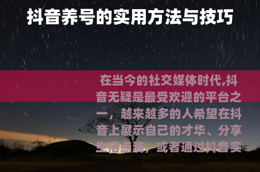 在当今的社交媒体时代,抖音无疑是最受欢迎的平台之一,越来越多的人希望在抖音上展示自己的才华、分享生活点滴,或者通过抖音实现商业价值,要在抖音上获得成功,养号是一个至关重要的环节。