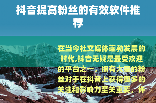 在当今社交媒体蓬勃发展的时代,抖音无疑是最受欢迎的平台之一,拥有大量的粉丝对于在抖音上获得更多的关注和影响力至关重要,许多人都在寻找能够帮助他们提高抖音粉丝数量的软件,今天就来给大家介绍几款实用的抖音提高粉丝的软件。