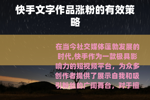 在当今社交媒体蓬勃发展的时代,快手作为一款极具影响力的短视频平台,为众多创作者提供了展示自我和吸引粉丝的广阔舞台,对于擅长文字创作的用户来说,如何通过快手文字作品实现涨粉,是一个值得深入探讨的话题。