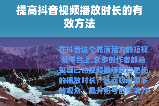 在抖音这个充满活力的短视频平台上,众多创作者都希望自己的视频能够获得更长的播放时长,从而吸引更多的观众,提升账号的影响力,究竟该如何提高抖音视频的播放时长呢?以下是一些实用的方法。 的质量至关重要,要确保视频内容具有吸引力、趣味性和实用性,可以通过深入了解目标受众的兴趣点,制作出符合他们口味的视频,如果你的受众是年轻人,那么可以选择时尚、娱乐、游戏等热门话题;如果是职场人士,就可以制作一些关于职业技能提升、职场经验分享等方面的内容,只有当视频内容能够真正满足用户的需求,他们才会愿意花更多的时间去观看。
