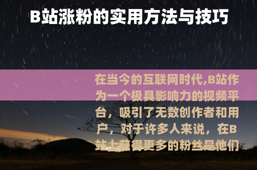在当今的互联网时代,B站作为一个极具影响力的视频平台,吸引了无数创作者和用户,对于许多人来说,在B站上获得更多的粉丝是他们努力的目标之一,B站如何涨粉呢?以下是一些实用的方法和技巧。 质量是关键,要制作出高质量、有吸引力的视频内容,这意味着要在选题上多下功夫,选择那些热门且有话题性的主题,能够引起观众的兴趣和共鸣,如果你擅长游戏,可以制作精彩的游戏攻略、搞笑的游戏实况等;如果你对美食感兴趣,那么可以分享独特的美食制作过程或美食探店视频,要注重视频的制作水平,包括画面的清晰度、剪辑的流畅性以及声音的质量等,一个制作精良的视频会给观众留下更好的印象,从而增加他们关注你的可能性。