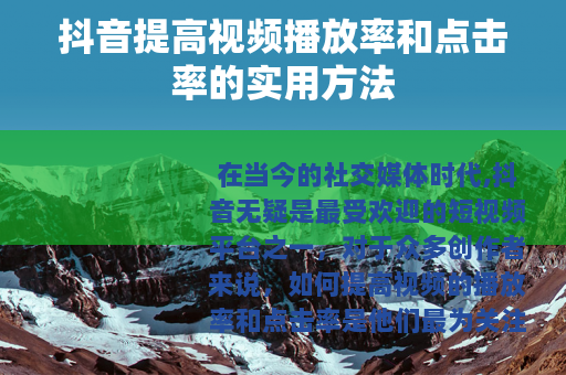 在当今的社交媒体时代,抖音无疑是最受欢迎的短视频平台之一,对于众多创作者来说,如何提高视频的播放率和点击率是他们最为关注的问题,以下是一些在抖音上提高视频播放率和点击率的有效方法。 是关键,要确保你的视频内容具有吸引力和独特性,了解你的目标受众,制作出他们感兴趣的内容,如果你面向的是年轻群体,那么时尚、潮流、娱乐等方面的内容可能会更受欢迎,要保持内容的新鲜感,避免重复和单调的主题,这样才能让用户持续关注你的视频。