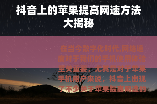 在当今数字化时代,网络速度对于我们的手机使用体验至关重要,尤其是对于苹果手机用户来说,抖音上出现了不少关于苹果提高网速的方法,下面就为大家详细介绍几种备受关注的方式。