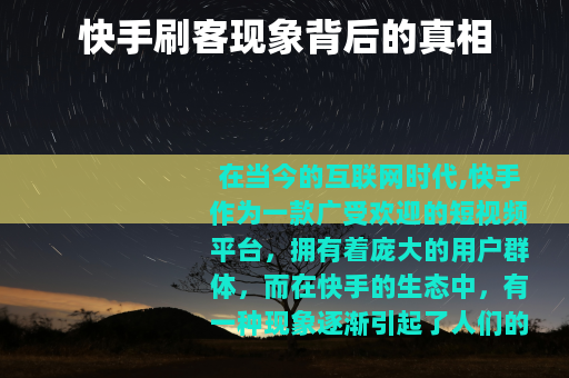 在当今的互联网时代,快手作为一款广受欢迎的短视频平台,拥有着庞大的用户群体,而在快手的生态中,有一种现象逐渐引起了人们的关注,那就是快手刷客。