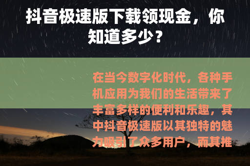 在当今数字化时代,各种手机应用为我们的生活带来了丰富多样的便利和乐趣,其中抖音极速版以其独特的魅力吸引了众多用户,而其推出的下载领现金活动,更是引发了广泛的关注和参与热潮。