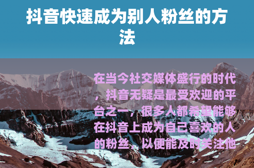 在当今社交媒体盛行的时代,抖音无疑是最受欢迎的平台之一,很多人都希望能够在抖音上成为自己喜欢的人的粉丝,以便能及时关注他们的动态,那么抖音怎么变成别人的粉丝呢?下面就为大家介绍几种简单有效的方法。