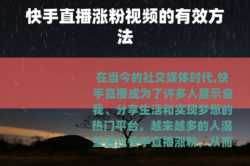 在当今的社交媒体时代,快手直播成为了许多人展示自我、分享生活和实现梦想的热门平台,越来越多的人渴望通过快手直播涨粉,从而扩大自己的影响力和实现更多的可能,如何在快手上通过直播涨粉呢?以下是一些实用的方法。