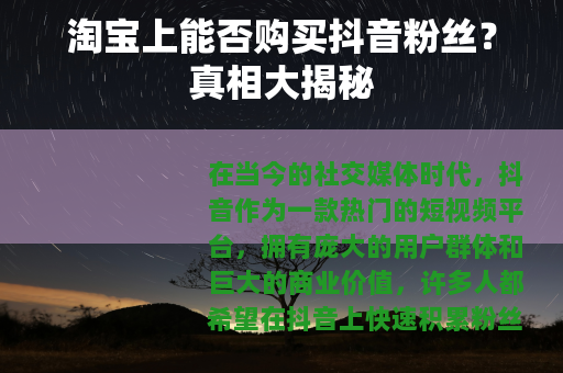 在当今的社交媒体时代,抖音作为一款热门的短视频平台,拥有庞大的用户群体和巨大的商业价值,许多人都希望在抖音上快速积累粉丝,以提高自己的影响力和商业机会,一个问题就应运而生:淘宝可以买抖音粉丝吗?
