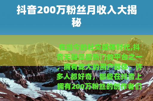 在当今的社交媒体时代,抖音无疑是最热门的平台之一,拥有庞大的用户群体,许多人都好奇,那些在抖音上拥有200万粉丝的创作者们,每个月究竟能有多少收入呢?
