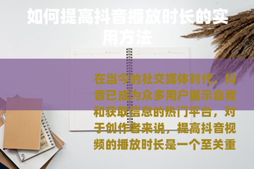 在当今的社交媒体时代,抖音已成为众多用户展示自我和获取信息的热门平台,对于创作者来说,提高抖音视频的播放时长是一个至关重要的目标,它不仅能增加视频的曝光度,还能提升账号的影响力,怎么提高抖音播放时长呢?以下是一些实用的方法。 是关键,确保你的视频内容具有吸引力和价值,可以从用户的兴趣点出发,比如热门话题、生活技巧、娱乐搞笑等,通过深入了解目标受众的需求,制作出他们真正感兴趣的内容,这样才能让观众愿意花更多的时间观看你的视频,如果你面向的是美食爱好者,那么分享独特的美食制作过程、餐厅探店或者美食文化知识等,都能吸引他们的关注并延长播放时长。