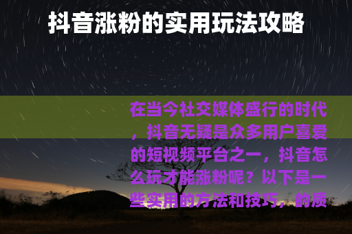 在当今社交媒体盛行的时代,抖音无疑是众多用户喜爱的短视频平台之一,抖音怎么玩才能涨粉呢?以下是一些实用的方法和技巧。