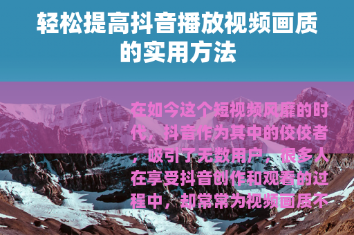 在如今这个短视频风靡的时代,抖音作为其中的佼佼者,吸引了无数用户,很多人在享受抖音创作和观看的过程中,却常常为视频画质不够清晰而烦恼,怎么提高抖音播放视频的画质呢?下面就为大家详细介绍一些有效的方法。