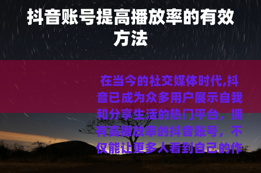 在当今的社交媒体时代,抖音已成为众多用户展示自我和分享生活的热门平台,拥有高播放率的抖音账号,不仅能让更多人看到自己的作品,还能带来更多的关注和互动,抖音账号怎样提高播放率呢?以下是一些实用的方法。 质量是关键,要确保你的视频内容具有吸引力、趣味性和独特性,可以从热门话题中寻找灵感,但要加入自己的创意和观点,让观众在众多相似的视频中眼前一亮,如果你擅长烹饪,那么可以制作一些独特的美食制作视频,通过精美的画面和详细的步骤讲解,吸引美食爱好者的关注。