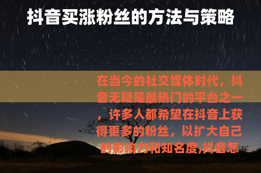 在当今的社交媒体时代,抖音无疑是最热门的平台之一,许多人都希望在抖音上获得更多的粉丝,以扩大自己的影响力和知名度,抖音怎么样买涨粉丝呢?