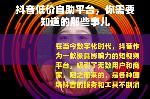 在当今数字化时代,抖音作为一款极具影响力的短视频平台,吸引了无数用户和商家,随之而来的,是各种围绕抖音的服务和工具不断涌现,其中抖音低价自助平台也备受关注。