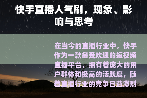 在当今的直播行业中,快手作为一款备受欢迎的短视频直播平台,拥有着庞大的用户群体和极高的活跃度,随着直播行业的竞争日益激烈,一种名为“快手直播人气刷”的现象逐渐进入了大众的视野。