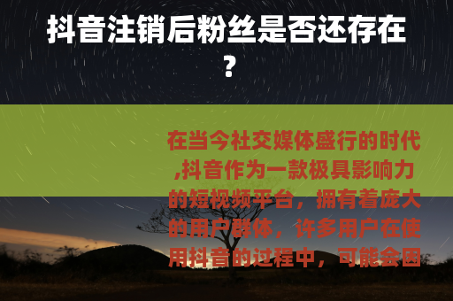 在当今社交媒体盛行的时代,抖音作为一款极具影响力的短视频平台,拥有着庞大的用户群体,许多用户在使用抖音的过程中,可能会因为各种原因考虑注销自己的账号,而其中一个备受关注的问题就是:抖音注销后粉丝还在不在呢?