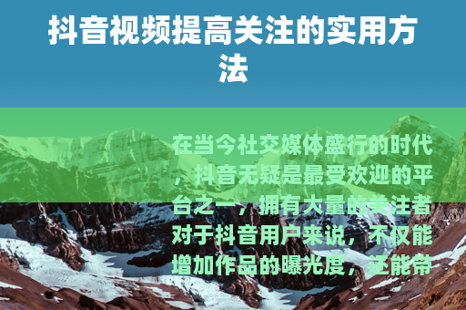 在当今社交媒体盛行的时代,抖音无疑是最受欢迎的平台之一,拥有大量的关注者对于抖音用户来说,不仅能增加作品的曝光度,还能带来更多的互动和机会,抖音视频怎么提高关注呢?以下是一些实用的方法。