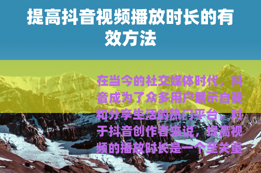 在当今的社交媒体时代,抖音成为了众多用户展示自我和分享生活的热门平台,对于抖音创作者来说,提高视频的播放时长是一个至关重要的目标,它不仅能增加视频的曝光度,还有助于提升账号的活跃度和影响力,怎么提高抖音视频播放时间长短的方法是什么呢?以下是一些实用的技巧。 是关键,要确保视频内容具有吸引力和价值,可以从用户的兴趣点出发,选择热门且独特的主题,如果你擅长烹饪,那么制作精美的美食制作过程视频,详细展示食材的准备、烹饪步骤以及最终成品的呈现,会让观众产生浓厚的兴趣并愿意花时间观看,在内容中加入一些有趣的故事或情节,能够更好地抓住用户的眼球,引发他们的情感共鸣,从而延长观看时间。