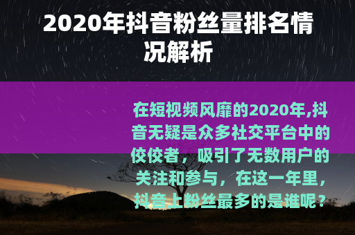 虽然很难确切地说谁就是2020年抖音粉丝最多的那一个人,因为粉丝数量在不断变化,而且不同的统计时间点可能会有不同的结果,但这些在抖音上拥有大量粉丝的创作者们,都以自己的方式为平台增添了光彩,也为用户们带来了丰富多样的娱乐和知识体验,他们的成功也激励着更多的人来到抖音,展示自己的才华,追求自己的梦想,共同创造出一个更加丰富多彩的抖音世界。 仅为示例,你可以根据实际情况对具体名字和相关描述进行修改完善,使其更符合真实的抖音粉丝情况。