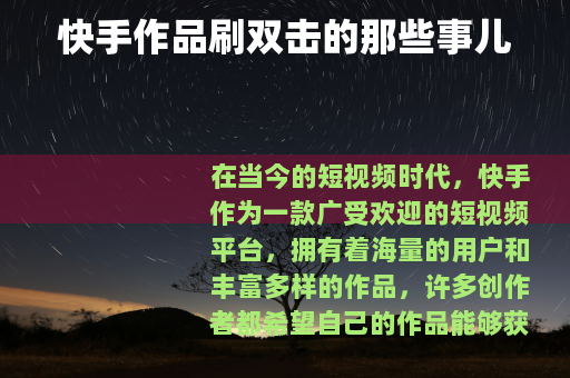 快手作品的双击数量在一定程度上反映了作品的受欢迎程度和质量,有些创作者可能会为了追求高双击量而寻找一些捷径,就出现了所谓的快手作品刷双击网址这样的现象。