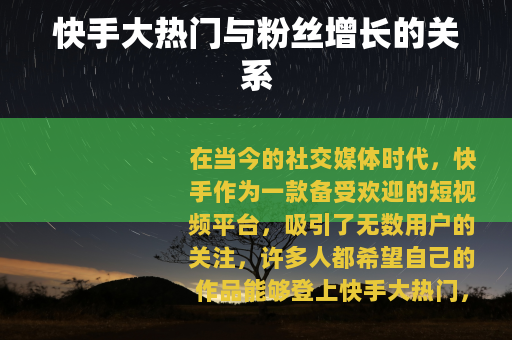 在当今的社交媒体时代,快手作为一款备受欢迎的短视频平台,吸引了无数用户的关注,许多人都希望自己的作品能够登上快手大热门,从而获得更多的曝光和粉丝,快手大热门究竟能涨多少粉丝呢?